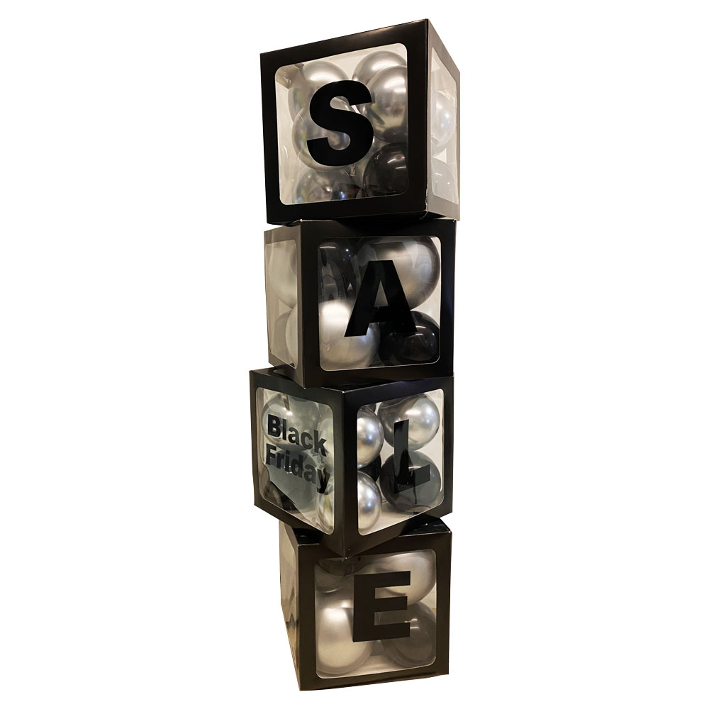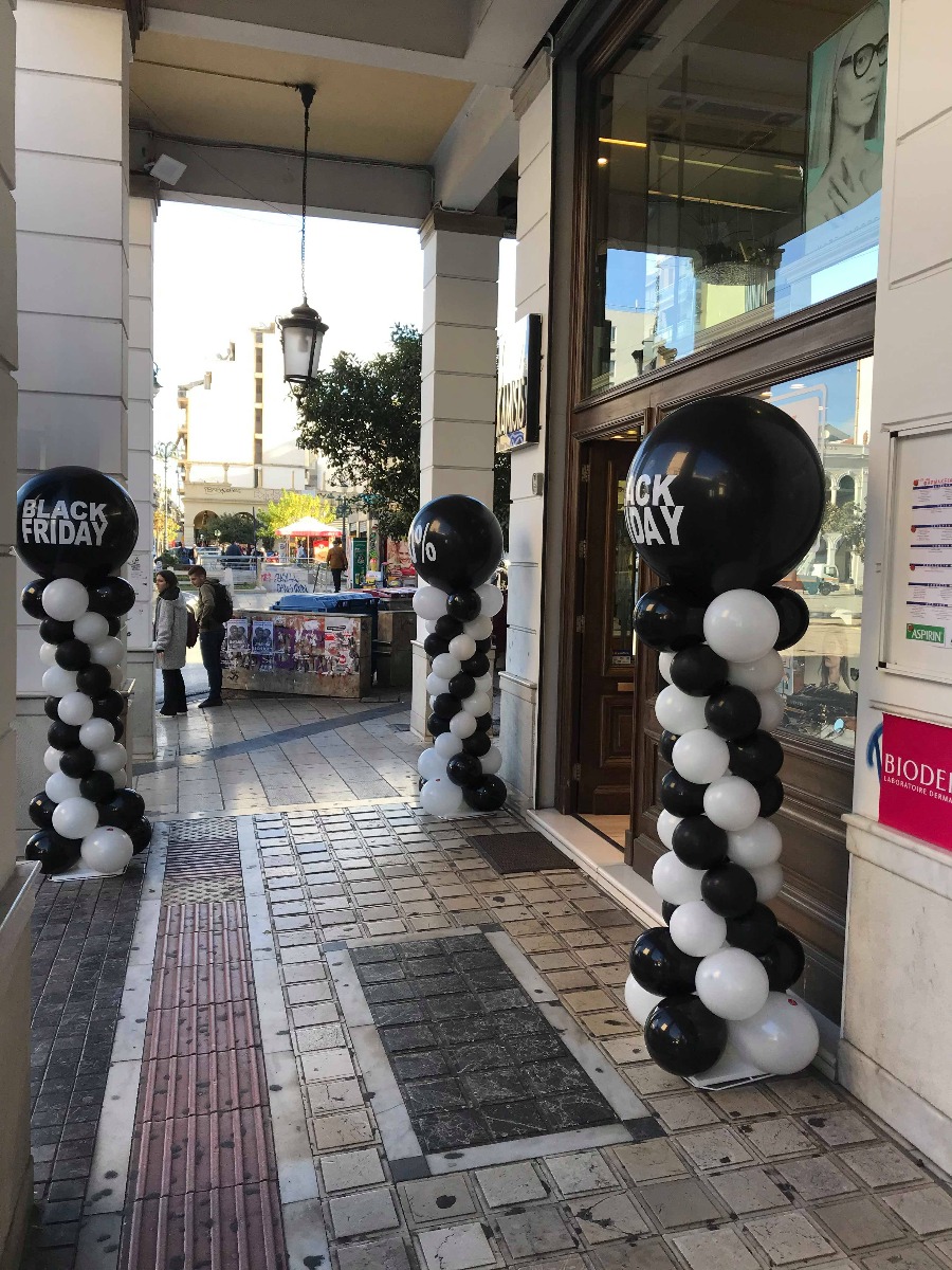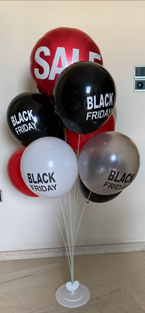 Τα μπαλόνια είναι η ιδανική λύση για να γίνει στοχευμένη προβολή και ενημέρωση στο καταναλωτικό κοινό. Υπάρχουν μπαλόνια που αναγράφουν τα ποσοστά των εκπτώσεων που ποικίλουν από προϊόν σε προϊόν, έντονα τη λέξη SALE και φυσικά το Black Friday που συνδυάζεται με όλα αυτα. Η διάρκεια ζωής των μπαλονιών υπερκαλύπτει την περίοδο της Black Friday και έτσι τα μπαλόνια αποτελούν την εύκολη, οικονομική και στοχευμένη διαφημιστική προβολή. Η Black Friday αν και προέρχεται από την Αμερική έχει ανταπόκριση σε όλες τις Ευρωπαϊκές, αλλά και Ασιατικές χώρες, με καταναλωτικό οίστρο από πολλούς φανατικούς καταναλωτές που κυνηγούν τη χαμηλή τιμή.