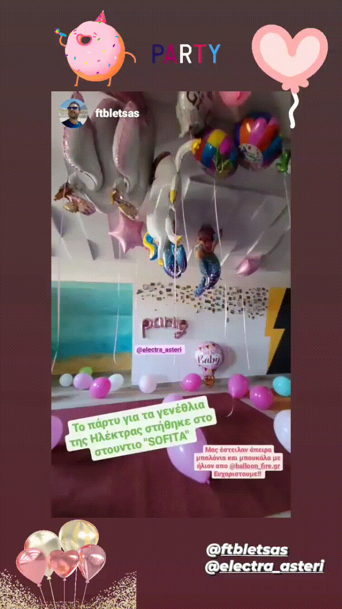 Ο Happy Traveller της ομώνυμης ταξιδιωτικής εκπομπής ήθελε να διοργανώσει την πιο όμορφη έκπληξη που να τα έχει όλα καθώς η σύζυγός του είχε γενέθλια στις 25 Ιουλίου αλλά ταυτοχρόνως ήθελε και να γιορτάσουν το χαρμόσυνο γεγονός της γέννησης της δεύτερης κορούλας τους, η οποία ήρθε στον κόσμο μόλις λίγες ημέρες πριν. Συνεπώς, το πάρτι – έκπληξη της Ηλέκτρας Αστέρη περιλάμβανε μπαλόνια λάτεξ με την αναγραφή Happy Birthday, μπαλόνια αλουμινίου σε σχήμα αστέρι σε ροζ χρώμα ενώ την παράσταση έκλεψε το μπαλόνι σε σχήμα λουλούδι με την αναγραφή Happy Birthday, το οποίο είναι ξεκάθαρα ορατό στη φωτογραφία που μοιράστηκε ο Ευτύχης Μπλέτσας με τους followers του στο Instagram. Τόσο ο Ευτύχης Μπλέτσας όσο και η Ηλέκτρα Αστέρη έκαναν, επίσης, story στο Instagram στο οποίο πρωταγωνιστεί το μπαλόνι με τη σχηματισμένη λέξη Party!